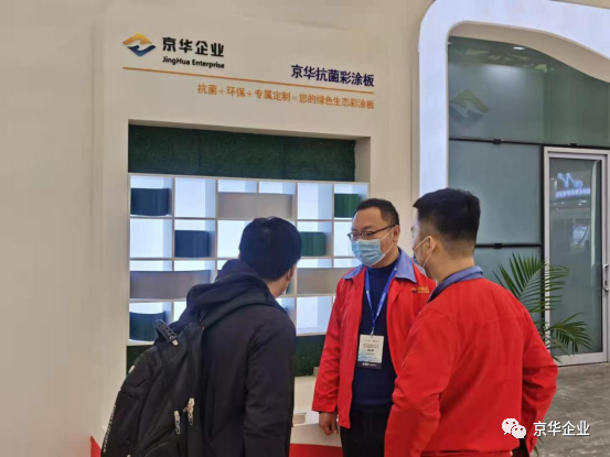 展覽會(huì)上各界人士紛至沓來,京華兆建作為金屬板材涂鍍解決方案專業(yè)供應(yīng)商,在展位上部署了專業(yè)的工作人員,為來往人員進(jìn)行耐心詳盡地講解,并展示高端彩涂板系列產(chǎn)品樣板。京華兆建的生產(chǎn)產(chǎn)品涵蓋精品冷軋板、熱鍍鋅板、熱鍍鋁鋅板、高強(qiáng)結(jié)構(gòu)鋼板、建筑彩涂板、京華精品板、高端彩涂板、醫(yī)院用抗菌彩涂板、畜牧業(yè)用彩涂板、凈化板、家電用彩涂板等多個(gè)領(lǐng)域。展位E1-A02上包括且不僅限于氟碳彩涂板、抗菌彩涂板、高耐候彩涂板等擁有科技專利的高端彩涂板呈現(xiàn)。