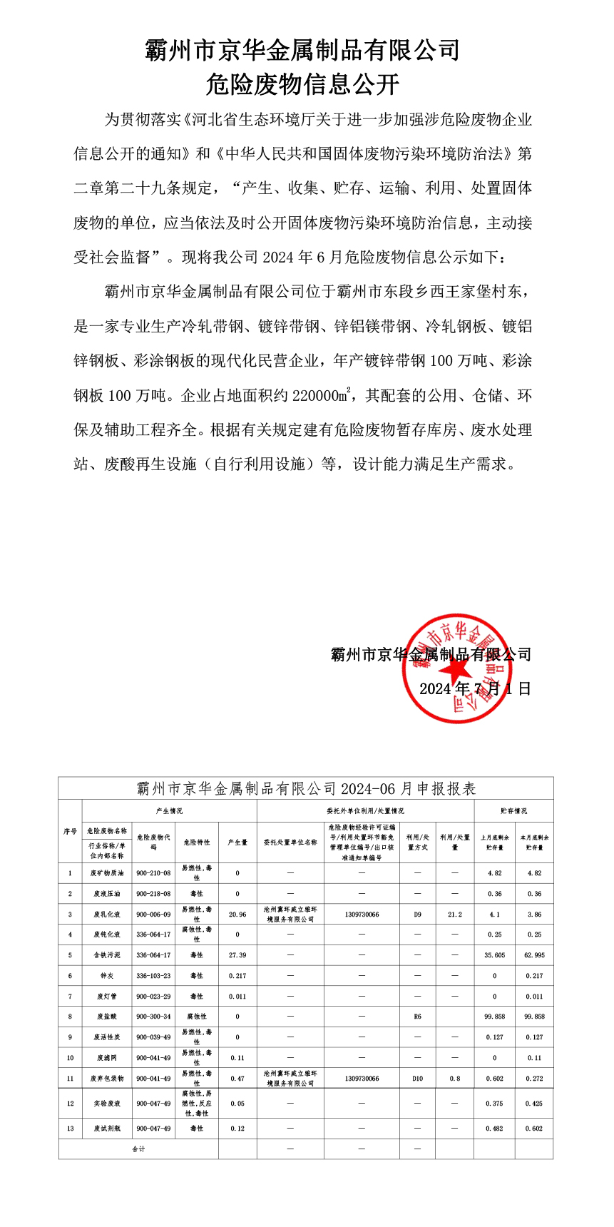 下一條:24年7月危險廢物信息公開-霸州市京華金屬制品有限公司
